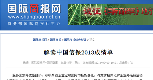文章原題:解讀中國信保2013成績單 文章地址:www.shangbao.net.cn/epaper/gjsb/254154.html 正文如下: 服務(wù)國家開放型經(jīng)濟(jì),積極幫助企業(yè)應(yīng)對國際市場新變化,有效承